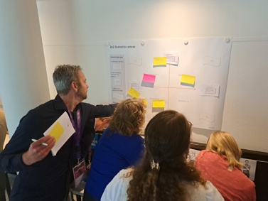 Wesley en Nancy deelden hoe de Innovatielabs bij Nova College zijn ingevoerd en tot welke resultaten dat intussen heeft geleid. In de presentatie is terug te lezen hoe (de medewerkers van de labs) docenten ontlasten en het onderwijs verrijken. In zeker opzicht is bij succesvolle samenwerking sprake van een Mattheuseffect: hoe meer het lab gebruikt wordt, hoe meer docenten positieve ervaringen delen, hoe meer anderen het willen gebruiken. Dat vraagt dan wel weer om goede organisatorische inbedding en afstemming met de opleidingsteams. Deelnemers gingen vervolgens met de Futuring methodiek aan de slag: daarin werkten zij scenario’s uit voor de mogelijke implementatie van een lab in de eigen organisatie. Zij bespraken daarin onder andere hoe je ervoor zorgt dat labs niet op zichzelf komen te staan, maar worden ingebed in de staande organisatie en het curriculum, en hoe je voorkomt dat dit een dienst wordt voor alleen excellente studenten (en docenten).