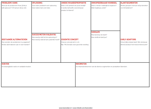 De toelichting van het Lean Canvas is te vinden op https://koensieben.nl/ondernemerschap/lean-canvas-model-download/